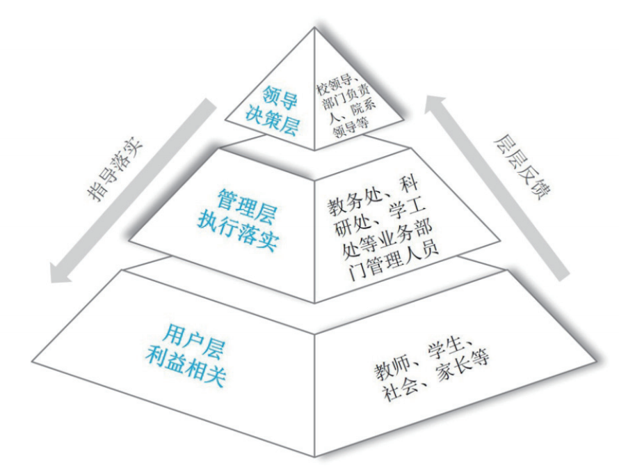 第三,完善治理结构,提升多元协同共治能力。进一步完善治理组织结构、培训和激励机制,形成自上而下的顶层规划、自下而上的执行反馈,营造多元协同共治的氛围。首先,完善治理组织结构,优化部门间协同机制。组织架构应包含决策层、管理层、用户层(如图 3)。决策层负责确立治理的目标、方针及政策,推动部门之间的交流合作;管理层肩负需求设计、执行落实、沟通反馈等多重任务;用户层包括全校师生、社会人员、学生家长等利益相关者。其次,加强数字化教育培训,提升师生数字素养。可通过岗前培训、日常培训、专题培训等方式,引导教师转换工作思维方式、升级工作方法。最后,健全激励机制,激发师生的创新活力。通过表彰或奖励的方式,充分调动师生参与数字治理的积极性,发挥多元主体的创新能力。