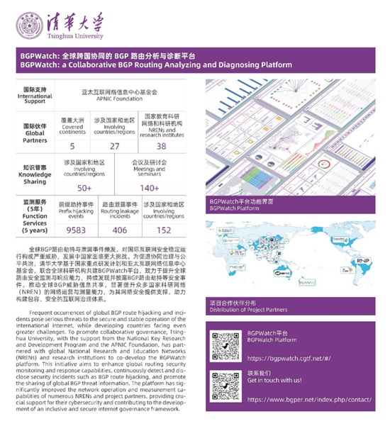 11月6日下午,2025年“携手构建网络空间命运共同体精品案例”在浙江乌镇世界互联网大会上发布,清华大学的“BGPWatch:全球跨国协同的BGP路由分析与诊断平台”入选12个精品案例。