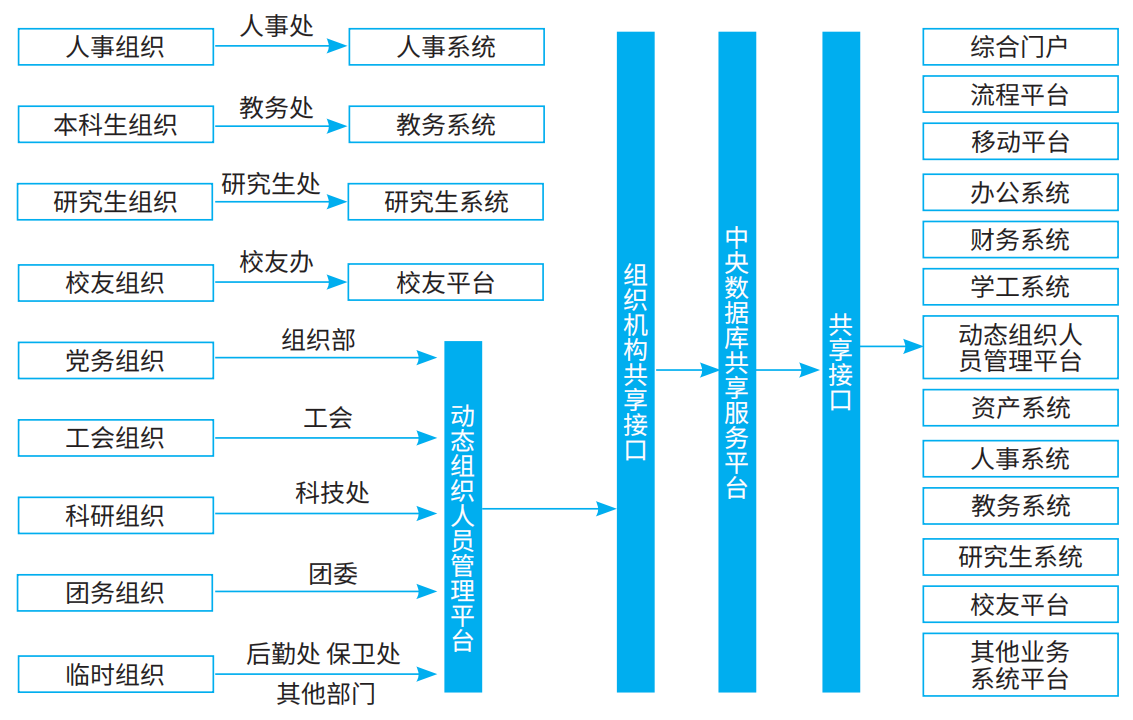 组织机构包括常用的人事组织、学生组织、党务组织以及工会组织等,其中人事组织由学校二级单位、科室系部等组成,学生组织由学生的专业、班级等元素组成。人事组织和学生组织一般都配备了成熟的管理系统,而党务、工会等组织则缺少相关系统平台。动态组织人员管理平台将管理这些数据并提供给其他业务系统,具体组织名称、管理平台、责任单位以及数据流向如图4所示。