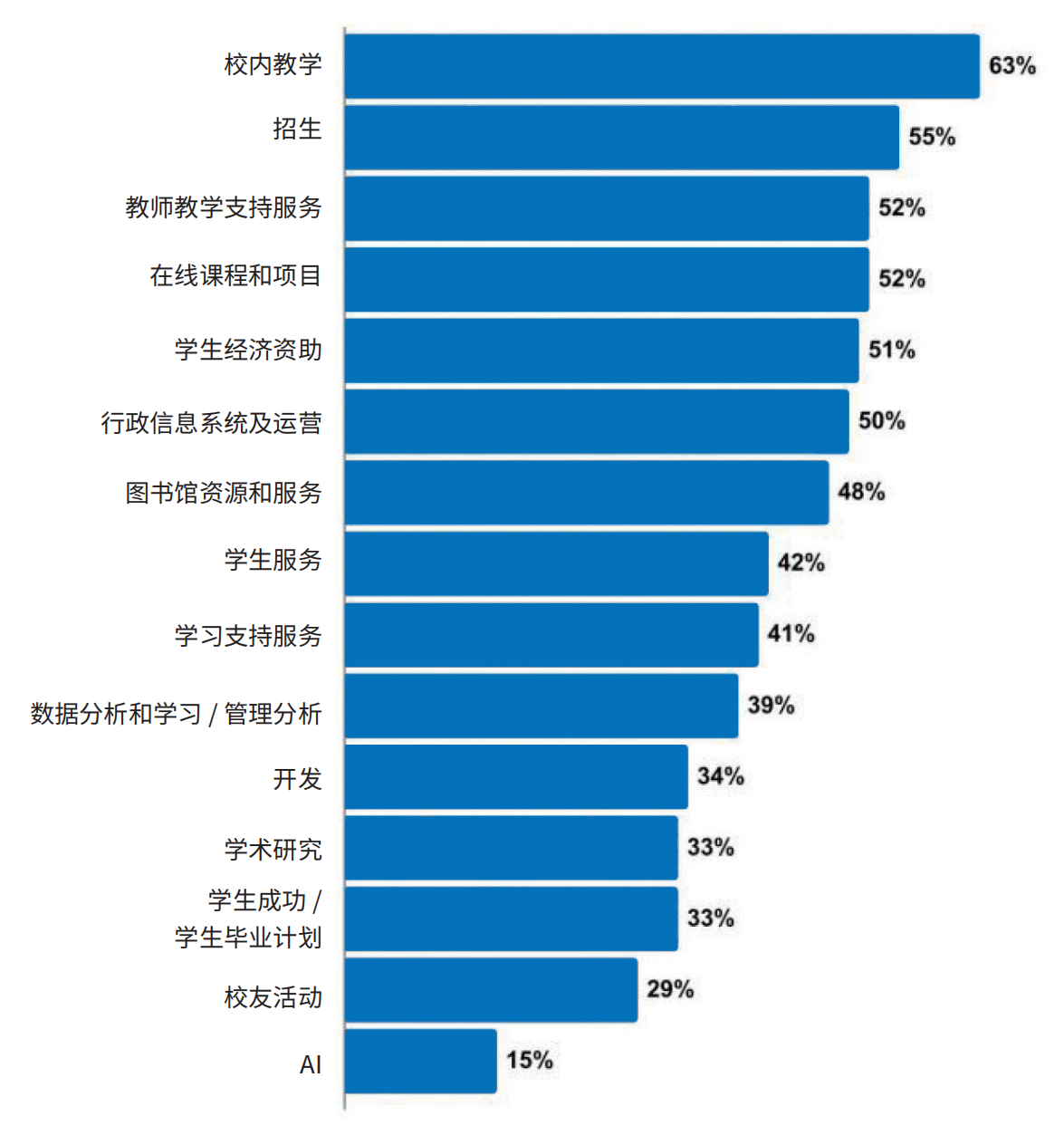与其他部门就AI问题的协同沟通相对顺畅。三分之二的CTO(66%)同意,IT与教务部门之间存在有效的沟通渠道,可就AI政策及其他关键议题展开协作。63%的受访者表示,学校领导正积极参与AI相关讨论并认为此事至关重要。但仅35%的CTO认为所在学校正在妥善应对AI的崛起,只有19%的CTO认为整个高等教育正在应对AI的崛起。同时,32%的CTO部分认同,所在大学对AI的依赖程度较前一年有显著提升。学校应用AI的主要领域是网络安全(51%)和虚拟助手及聊天机器人(49%),其中公立大学的CTO尤其倾向于后者。