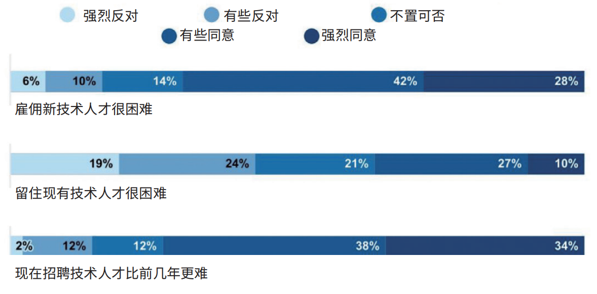 人才挑战。70%的CTO认同学校正面临招聘新技术人才的困境。另有37%的CTO表示学校难以留住现有的技术人才。在招聘和留任人才方面遇到困难的CTO们通常认为,其他组织普遍比高校提供更优厚的薪资和福利待遇。