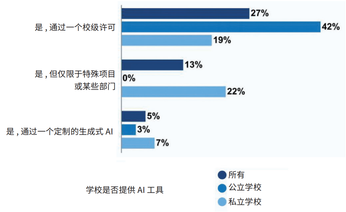 AI战略与访问权限缺失。约半数CTO(53%)认同所在大学更侧重于考虑AI的个体应用场景,而非企业级应用。仅11%的CTO表示学校制定了全面的AI战略。不到一半的CTO表示学校为学生提供生成式AI工具访问权限:27%通过全校性的许可证开放,13%限定特定院系或项目,5%采用定制工具。其中,半数CTO称相关费用由IT部门的预算承担。未开放学生访问权限的CTO普遍担忧成本问题。
