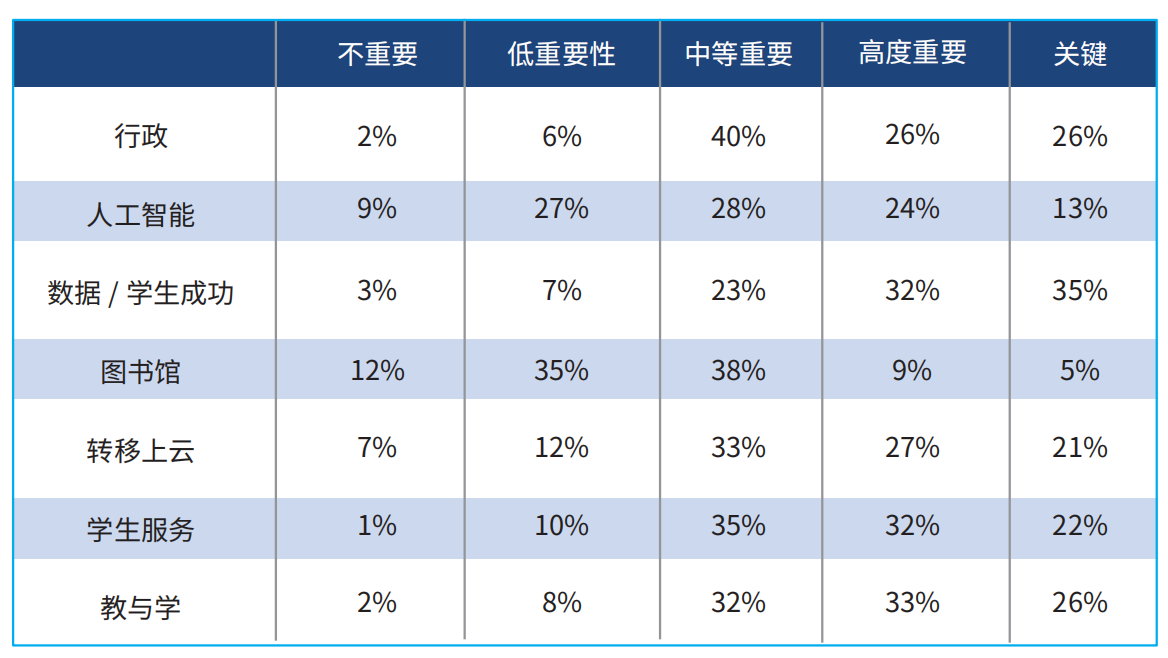 对基础设施和投资的看法不一。许多CTO(60%)或多或少认同,在技术需求方面,陈旧的基础设施正在阻碍创新。当被问及如何评价过去十年在信息技术资源和服务方面的投资成效时,教学投资获得了最高的评价(63%),而评价较低的领域是学生成功项目,仅33%的受访者认为投资成效显著。值得注意的是,91%的CTO认为学校的学习管理系统质量良好或优秀。除此之外,多数CTO(83%)认为学校支持教学的IT及数字资源质量良好或优秀,而仅有26%的CTO认为学校面向学生的IT培训质量良好或优秀。