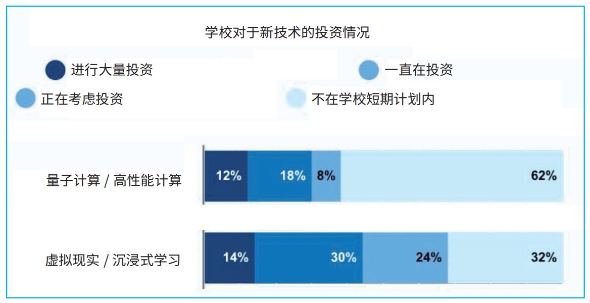 新兴技术投资不足。仅12%的CTO表示,所在学校在量子计算/高性能计算领域进行了投资,18%表示已开始投资。在虚拟现实和沉浸式学习方面,14%的CTO报告了实质性的投资,另有30%报告了初步投资。
