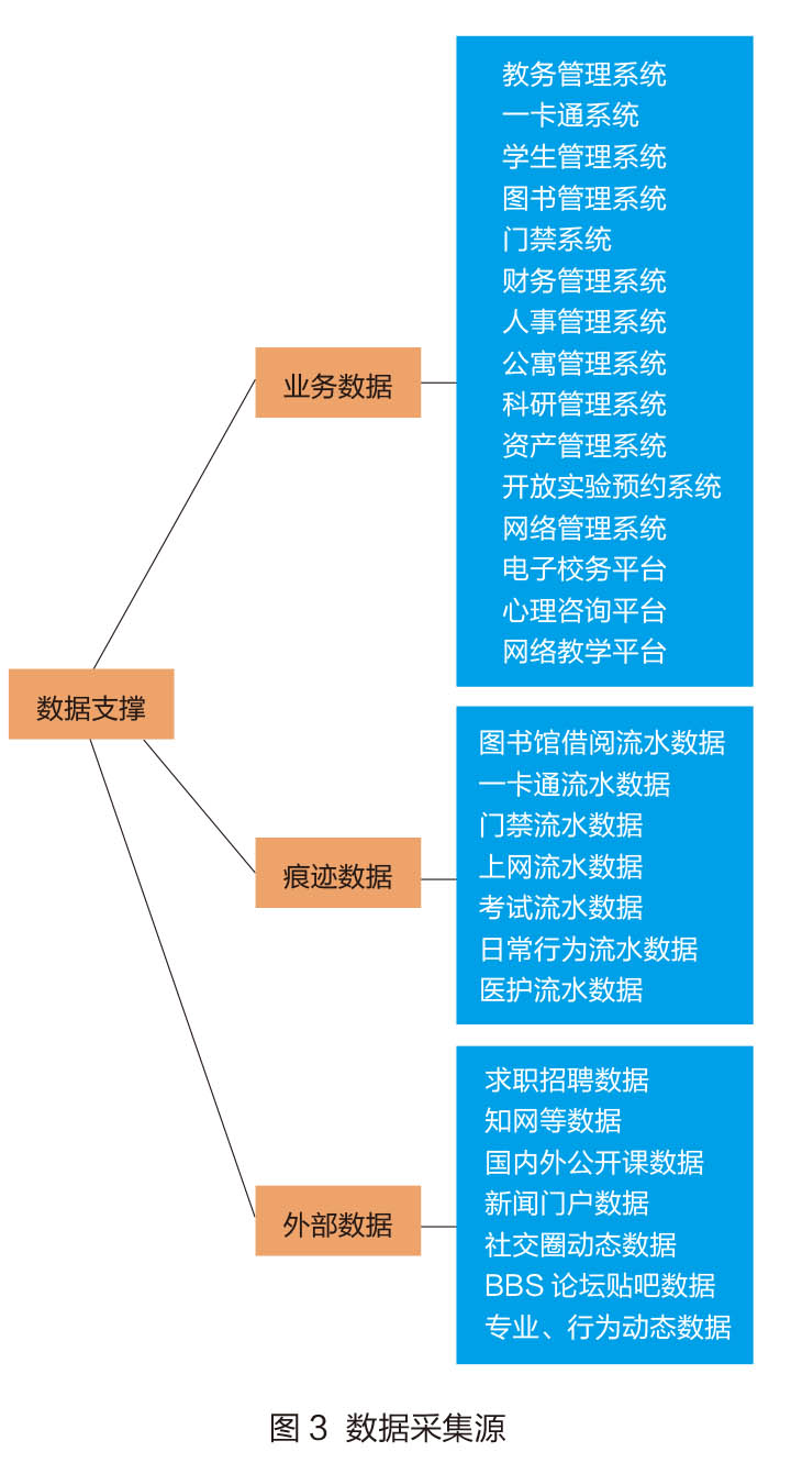 利用爬虫技术及日志分析技术,使数据来源多样化,使得学生素质“画像”力求全面、客观。因此主要在“应用系统格式化数据”、“各应用系统、网络设备运行日志数据(痕迹数据)”、“互联网数据”三个途径采集数据,按学习行为、生活行为、网络行为三个方面描述,归类划分标签。如图3数据采集源所示,其中:
