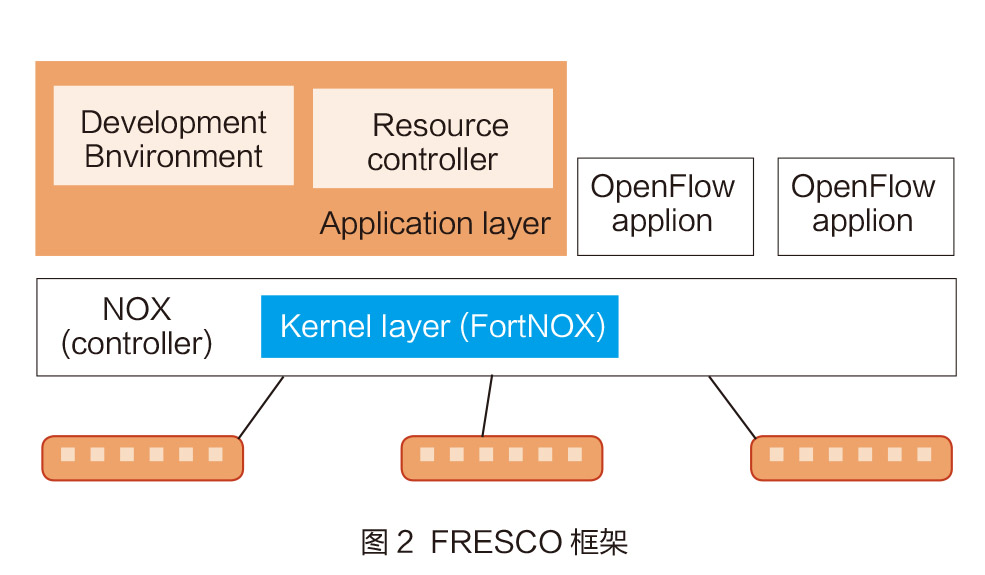 SDN作为一种新兴的网络技术,这几年在网络路由交换领域,特别是在数据中心网络和数据中心WAN网中得到了有效的应用,谷歌公司的B4方案成功地最大化谷歌全球数据中心的互联信道的使用率。在网络安全方面,SDN技术也被设计应用实现分流和DDoS防御等安全功能。SDN技术的优点不仅仅在于可以实现具体某一类的安全功能,而且在于其北向的应用编程接口为自动化的程序控制流量提供了统一的接口,同时SDN作为通用技术,可以通过流表和应用层逻辑实现细粒度的策略控制,即使是同一个目标地址的流量,可以根据安全的需求,实施不同的流量控制策略。如针对一个Web服务器,对于其Web服务端口的流量,可以转发至WAF等安全防御软件进行过滤,对于非Web服务端口的攻击流量,可以转发至蜜罐服务器进行攻击行为的捕获,同时还可以镜像感兴趣的流量至流量日志服务器进行记录。但如果由人力进行这些不同安全策略的配置,则可能会带来差错和配置效率的问题,美国德州农工大学的顾国飞教授将其称为“威胁响应策略转换的挑战”(Threat Response Transition Challenge)。如果可以将复杂的响应措施通过SDN统一的流表操作接口实现可编程的自动化工作,则可以进一步将自动响应技术引入到应急响应的根除、恢复、跟踪等阶段,并为检测和抑制阶段提供更细粒度的操作支持。在这方面有代表性的工作包括顾国飞教授的FRESCO和宾州大学JohnSonchack设计的OFX。FRESCO是一种基于SDN的模块化安全服务编程接口,在改进的NOX北向接口基础上,通过对安全服务进行抽象,设计并实现了16种服务模块,以及基本的编程语言,让用户可以在该编程接口基础上实现扫描检测、Botnet检测、DDoS防御等多种安全检测功能,并通过程序将不同的功能组合起来,如图2所示。OFX则提出了安全服务中间件(middlebox)的想法,将安全功能实现在SDN交换设备上,利用交换设备的CPU就近实现安全功能,解决报文在北向应用进行处理带来的效率问题。