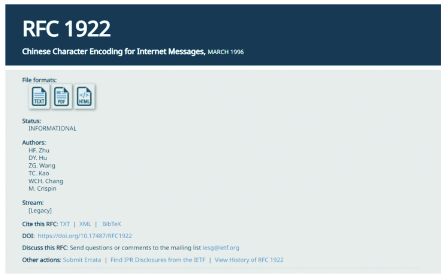 -1996年3月,清华大学胡道元教授团队提交的中文编码汉字统一传输标准,被国际互联网标准化组织IETF批准为RFC1922,这是中国大陆技术人员参与制定的第一个被IETF认可的互联网国际标准。