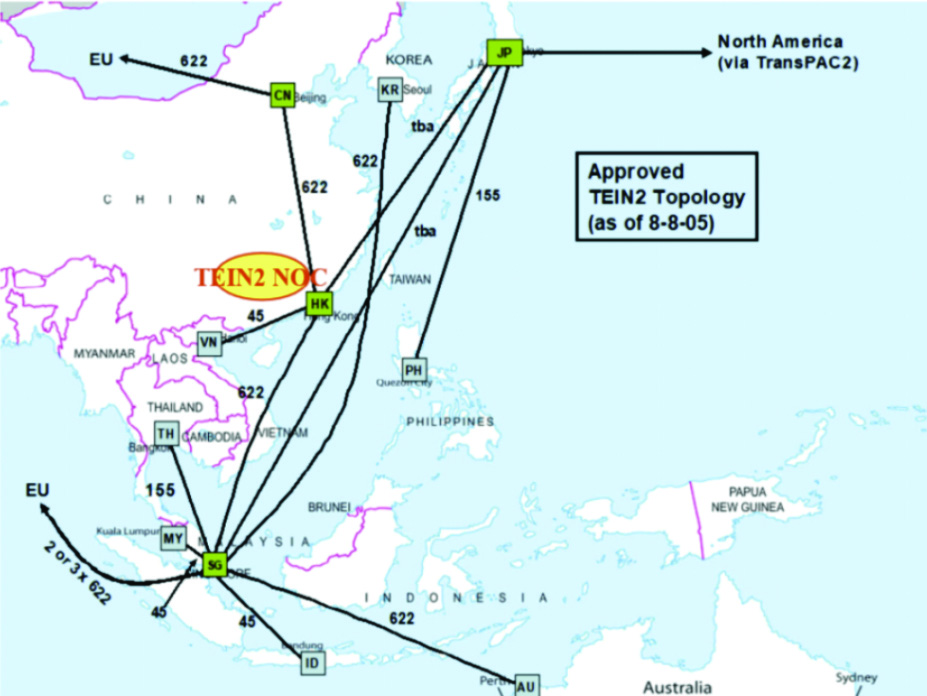 -2005年9月,CERNET网络中心中标欧盟第二代跨欧亚信息网络TEIN2主干网运行管理工作。这是中国的科研管理机构首次被授权管理国际性互联网络,也是国际上对我国管理并运行大规模学术网络能力的肯定,对中国在国际下一代互联研究中占据重要地位起到关键性作用。