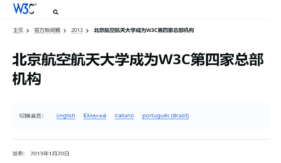 W3C官网发布北航成为第四家总部机构(2013)