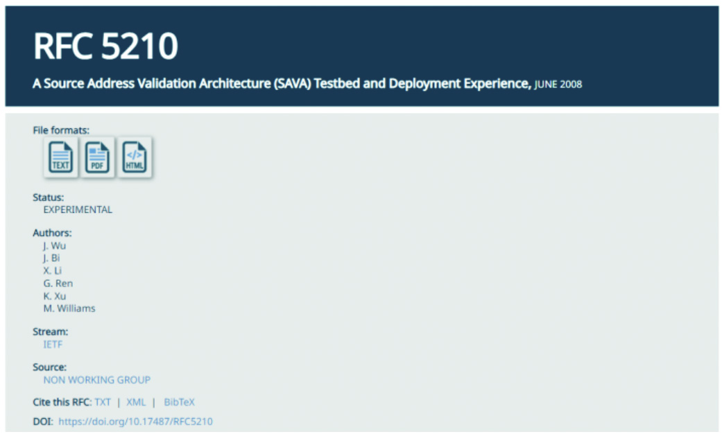 -2008年,由清华大学吴建平教授团队提出的“下一代互联网真实源地址验证体系结构SAVA”获IETF批准成为RFC 5210,这是中国在IETF发布的第一个非信息类标准,同时也是非中文相关的互联网核心技术领域以我国学者为主体署名的第一个互联网RFC,并后续主导形成该技术的系列化国际标准。SAVA项目获2012年度教育部技术发明一等奖,2020年度中国电子学会科学技术特等奖,2023年国家科学技术进步奖一等奖。