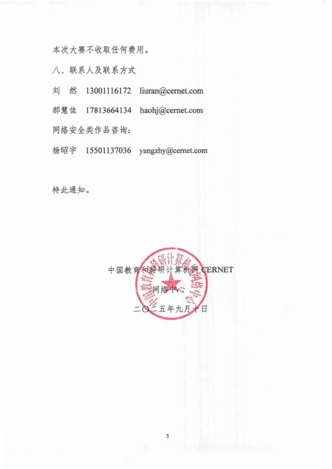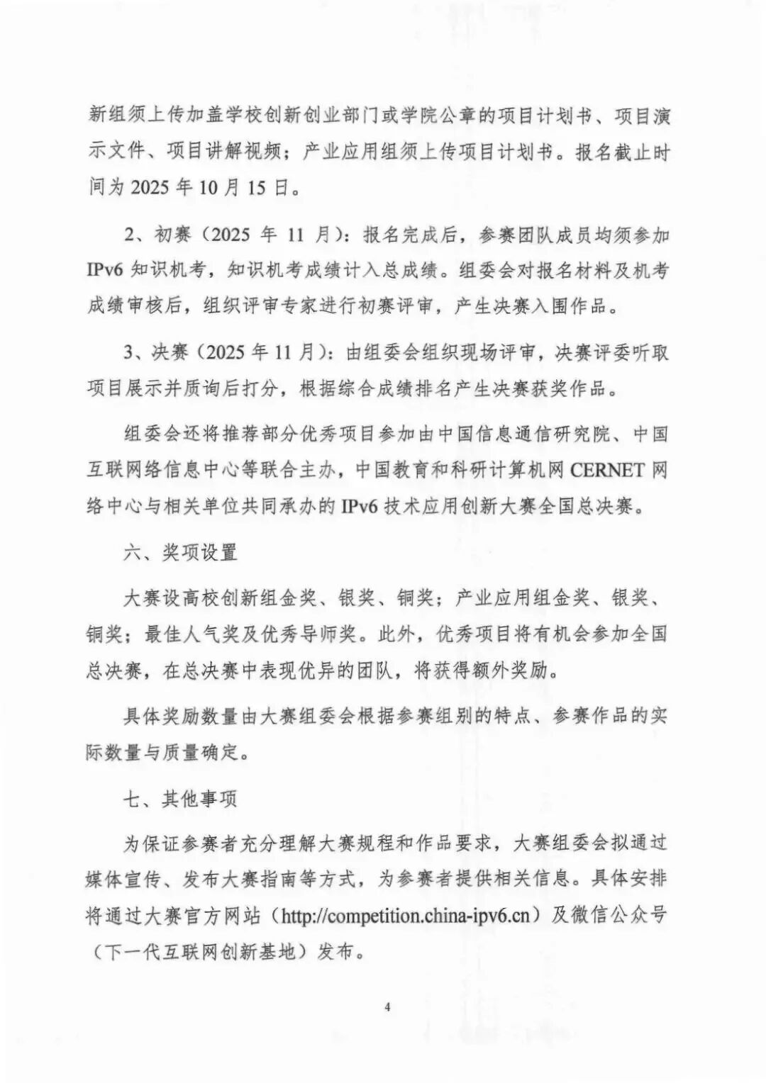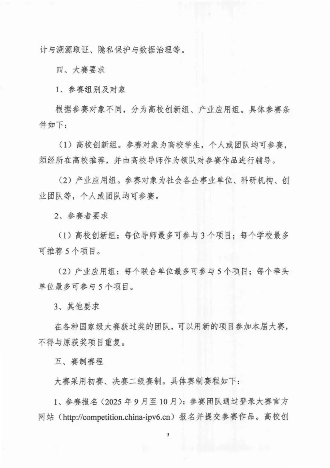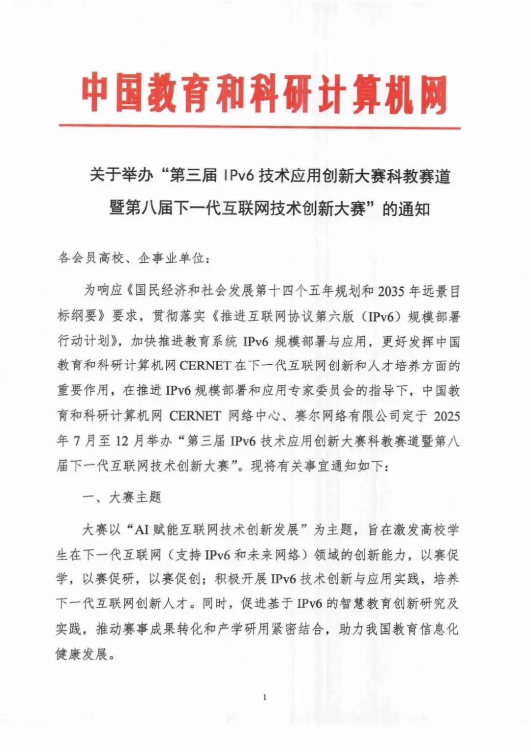 为响应《国民经济和社会发展第十四个五年规划和2035年远景目标纲要》要求,贯彻落实《推进互联网协议第六版(IPv6)规模部署行动计划》,加快推进教育系统IPv6规模部署与应用,更好发挥中国教育和科研计算机网CERNET在下一代互联网创新和人才培养方面的重要作用,在推进IPv6规模部署和应用专家委员会的指导下,中国教育和科研计算机网CERNET网络中心、赛尔网络有限公司定于2025年7月至12月举办“第三届IPv6技术应用创新大赛科教赛道暨第八届下一代互联网技术创新大赛”。现将有关事宜通知如下: