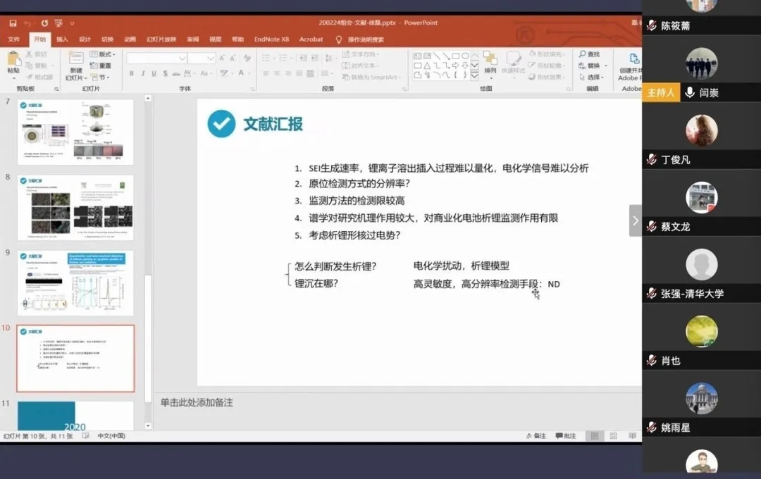 得益于之前的经验积累,此次疫情期间,课题组也吸取成功经验,及时开展了线上组会。为保证讨论的高效性,张强将组内同学按照锂硫电池、碳负极、电解液、固态电解质、理论计算五个研究方向分组,让同学们分别进行深入的探讨。目前,组会已经进行了十余次。