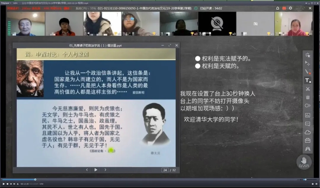 “《中国古代的政治与文化》《秦汉魏晋南北朝政治历程》两门课,我跟学生约定北京时间晚8:00上课,对我则是早7:00上课。这就要在头一天的晚上做好准备,早上提前起床。”