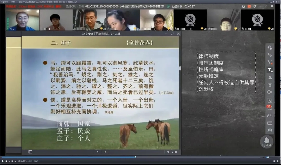 这学期,阎步克老师一共参与讲授四门线上课程:“中国古代的政治与文化”“中国古代官阶制度”“秦汉魏晋南北朝政治历程”“中国传统文化专题研讨”。