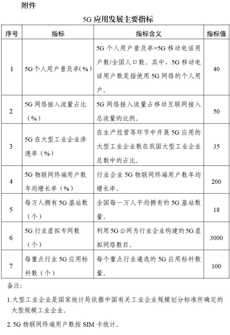 ——重点领域5G应用成效凸显。个人消费领域,打造一批“5G+”新型消费的新业务、新模式、新业态,用户获得感显著提升。垂直行业领域,大型工业企业的5G应用渗透率超过35%,电力、采矿等领域5G应用实现规模化复制推广,5G+车联网试点范围进一步扩大,促进农业水利等传统行业数字化转型升级。社会民生领域,打造一批5G+智慧教育、5G+智慧医疗、5G+文化旅游样板项目,5G+智慧城市建设水平进一步提升。每个重点行业打造100个以上5G应用标杆。