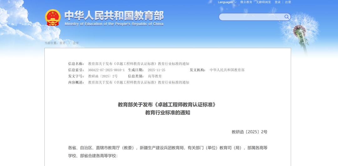 教育部关于发布《卓越工程师教育认证标准》