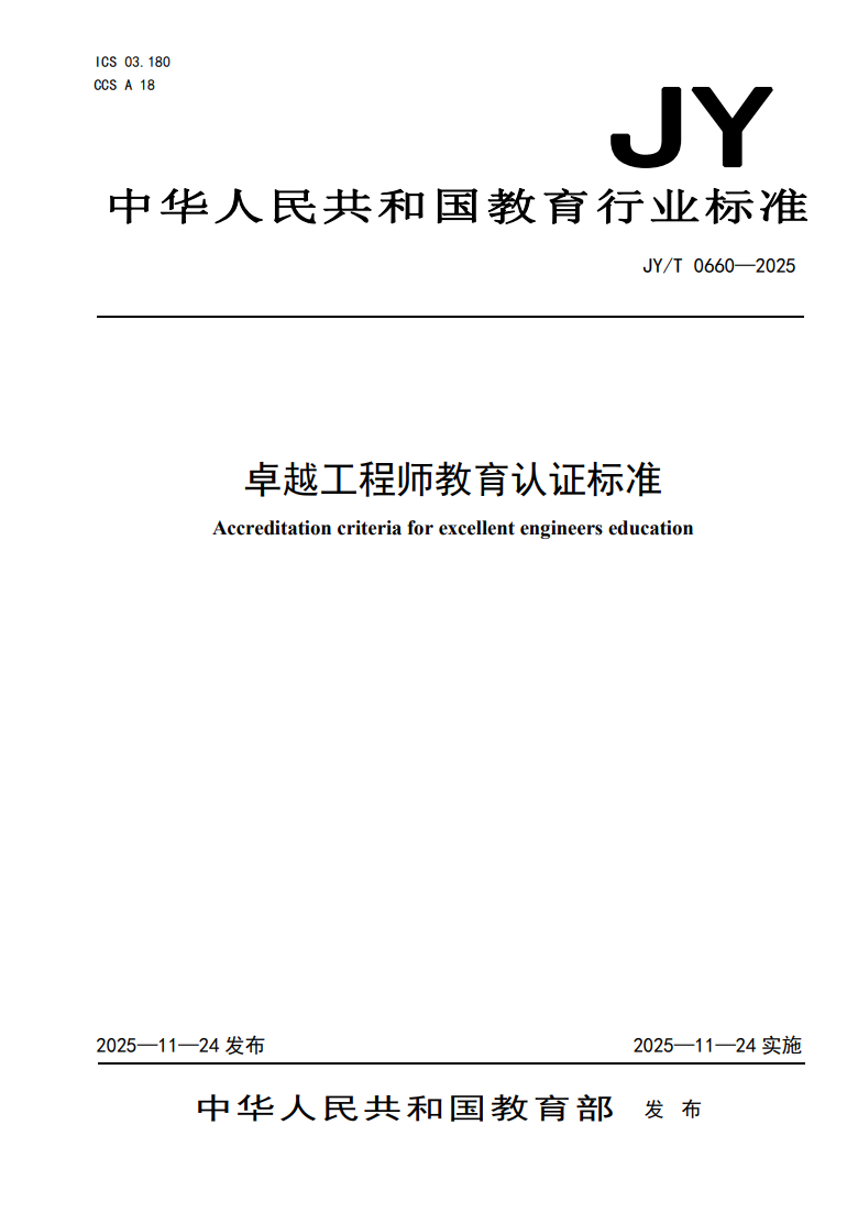 为深入贯彻党的二十大和二十届历次全会精神,贯彻落实习近平总书记重要讲话精神和中央人才工作会议、全国教育大会精神,落实《教育强国建设规划纲要(2024—2035年)》,加快构建中国特色、世界水平的卓越工程师培养体系,我部研究制定了《卓越工程师教育认证标准》,现作为教育行业标准予以发布,并自发布之日起施行。