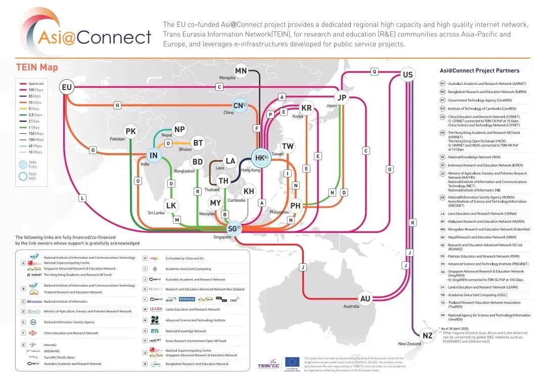 2025年10月,欧盟与跨欧亚信息网络合作中心(TEIN*CC,Trans-Eurasia Information Network Cooperation Center)启动跨欧亚信息网络运行中心(TEIN NOC)服务重新招标,面向亚太地区公开竞争。清华大学提交了标书,经过多轮评审再次中标。