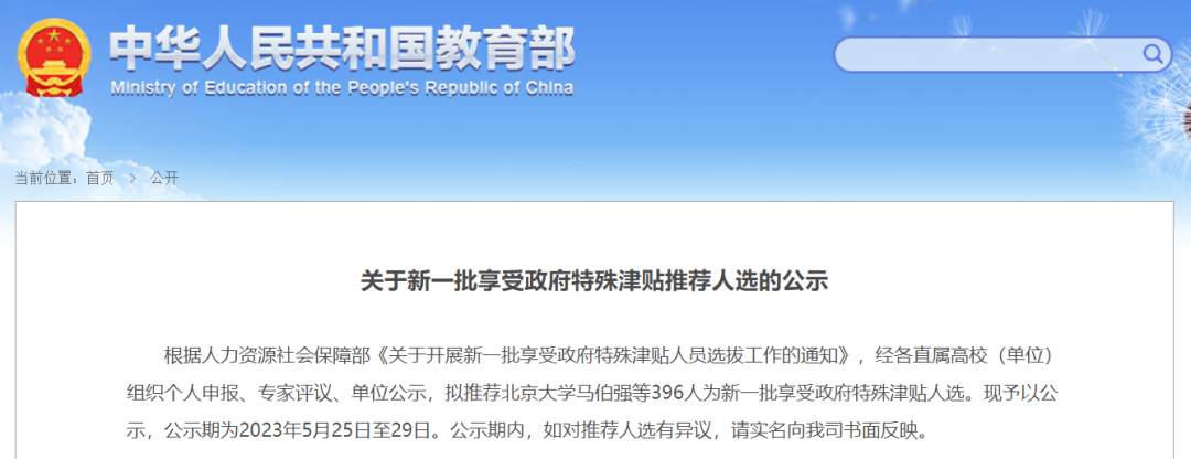 5月25日,教育部人事司发布《关于新一批享受政府特殊津贴推荐人选的公示》,经各直属高校(单位)组织个人申报、专家评议、单位公示,拟推荐396人为新一批享受政府特殊津贴人选。公示期为2023年5月25日至29日。
