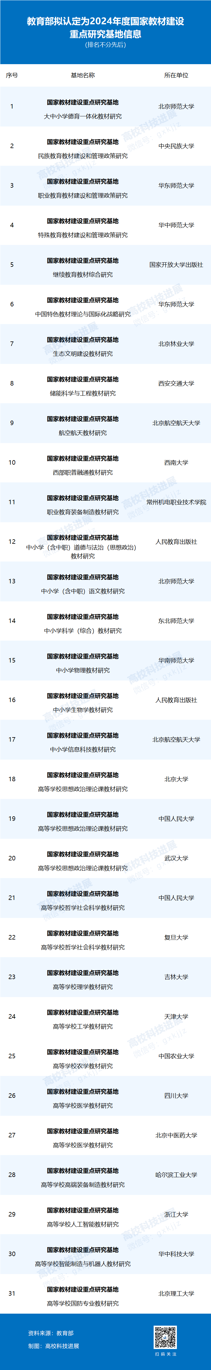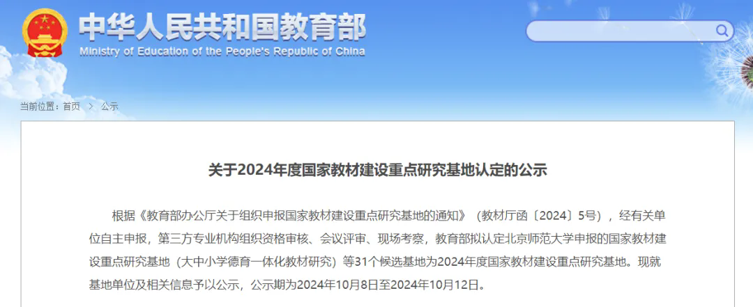 今日(10月8日),教育部印发《关于2024年度国家教材建设重点研究基地认定的公示》,拟认定北京师范大学申报的国家教材建设重点研究基地(大中小学德育一体化教材研究)等31个候选基地为2024年度国家教材建设重点研究基地,公示期为2024年10月8日至12日。