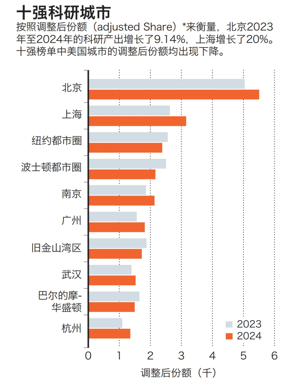 在2023年至2024年科研产出方面,北京增长超9%,上海增幅近20%,而同期全球十强中的所有美国城市份额均有所下滑。