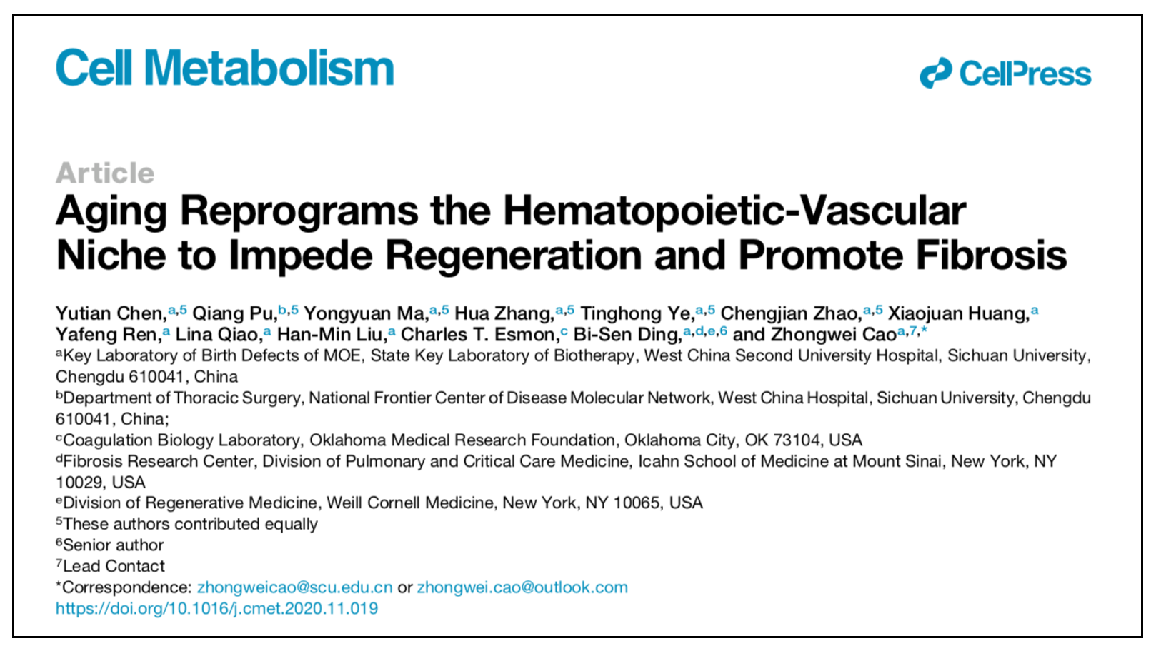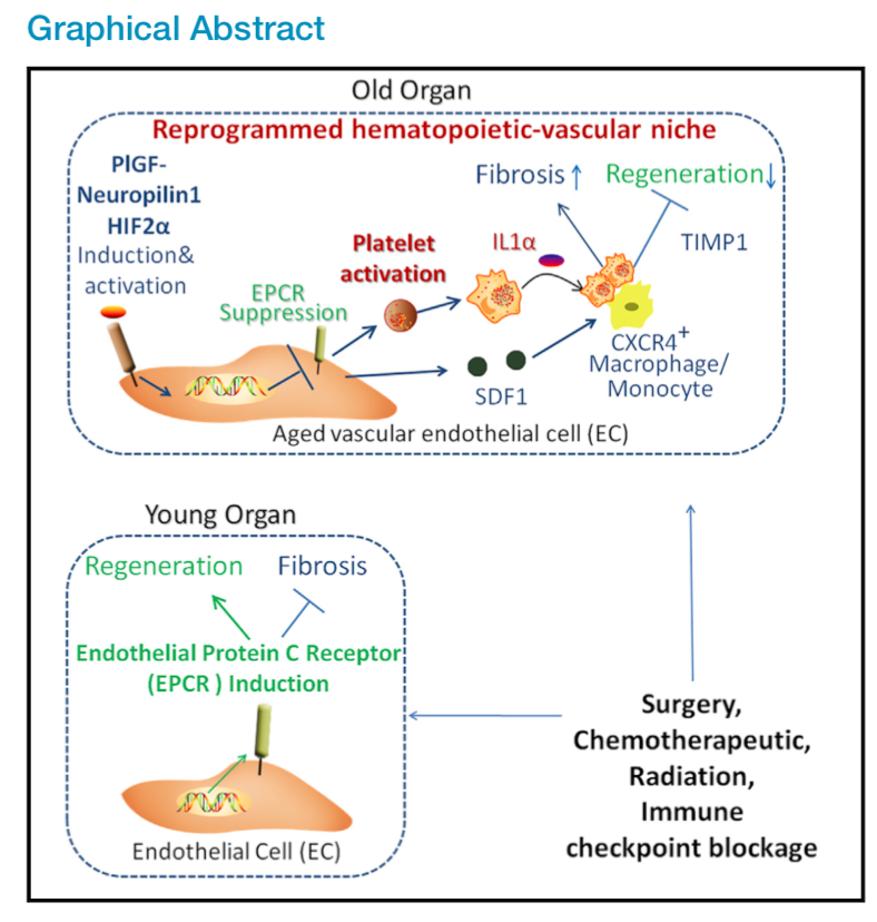 组织受到损伤之后的修复再生能力在生物体的生长过程中至关重要,但是这种能力会随着年龄的增长而逐渐丢失。具体表现为衰老器官受到损伤后其修复再生能力通常会受到抑制,相反会形成疤痕(纤维化),最终会导致器官功能衰竭。12月22日,我校华西二院妇产科教授、肿瘤微环境实验室PI曹中炜教授和干细胞微环境实验室PI丁楅森教授带领的课题组在国际顶级期刊杂志《Cell Metabolism》(《Cell》子刊)上发表题为“Aging Reprograms the Hematopoietic-Vascular Niche to Impede Regeneration and Promote Fibrosis”的研究论文。该研究成果揭示了由衰老引起的循环系统细胞(血管、血小板、巨噬细胞)之间的重编程,即:衰老器官受到损伤后,内皮细胞NRP1和HIF2α的异常诱导会抑制抗炎症和抗血栓形成的EPCR基因的表达,这种情况通常会激活血液中的血小板和巨噬细胞,形成一种促纤维化的微环境,从而抑制器官的再生。