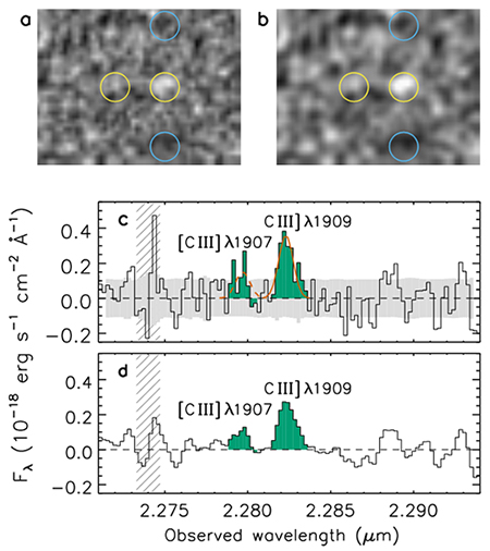 图a)和c)分别是二维和一维光谱,图b)和d)分别是相应的平滑后光谱。图中显示,二次电离碳位于静止波长191纳米左右的发射线,已经移至2283纳米左右,表明其红移为10.957,即距离在134亿光年外。