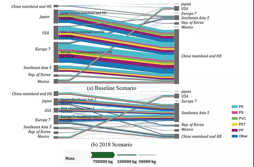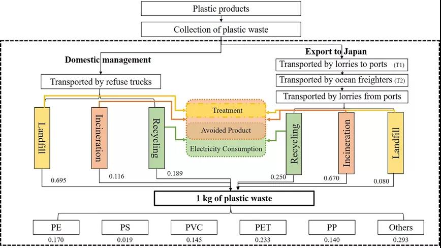 自20世纪90年代末以来,出于转移环境风险和填补原料空缺两个方面的各自需求,发达国家向发展中国家的废塑料输出不断加快并逐渐形成常态,给发展中国家带来了严峻的环境污染和生态健康问题。中国作为世界上曾经最主要的废塑料进口国和最大的塑料生产国, 2017年印发了《禁止洋垃圾入境推进固体废物进口管理制度改革实施方案》(下简称“禁令”),禁止了包括废塑料在内的24种固体废物的进口,导致全球废塑料贸易流动向东南亚国家的转移和整体流量的下降,从而倒逼世界各国的废塑料处理方式逐渐发生改变。由于各国对废塑料的处理方式及其结构比例各异,处理技术的成熟度各不相同,贸易流动及处理结构的改变势必会对全球环境可持续性造成巨大的影响,却尚未得到定量化的科学揭示。