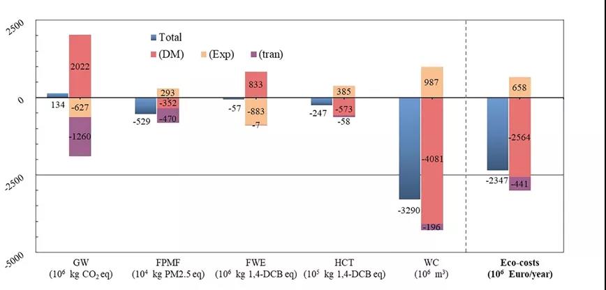 本研究进一步以1kg废塑料为单位建立废塑料贸易与处理系统开展环境影响评估。研究主要考虑将废塑料进行卫生填埋、焚烧和回收再生三种主要处理方式(图2),关注全球变暖、细颗粒物形成、淡水生态毒性、人类致癌毒性和用水量等5项与废塑料处理密切相关的中点指标,分别计算国内处理、出口、运输三个环节中全球环境影响变化的绝对值,从而识别2018年贸易流变化的环境影响及生态成本(图3)。贸易流量的变化仅对全球变暖产生了负面的环境影响,或多或少地改善了其他四个指标,整体上促进了全球环境的可持续性。经评估,中国“禁令”2018年在全球节约的生态成本高达23.5亿欧元,相当于2017年全球废塑料贸易金额的56%。