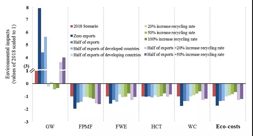 图4 出口量降低、回收率上升情景及组合情景的环境影响比较