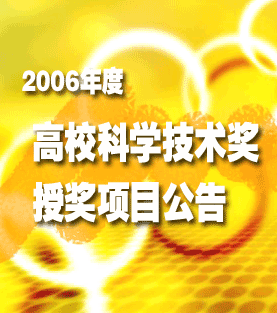 2006年度高等学校科学技术奖在同行专家评审的基础上,召开了专家评审会,评出拟授奖项目,经高等学校科学技术奖励委员会审核批准,现予以公布: 全部授奖项目:325项;一等:124项;二等:201项;其中自然科学奖:111项;一等:42项;二等:69项;技术发明奖:31项;一等:15项;二等:16项;科技进步奖:161项;一等:59项;二等:102项;推广类:10项;一等:5项;二等:5项;专利奖:12项;一等:3项;二等:9项; 此次公布的项目,自公布之日起一个月之内为异议期。在异议期内,无异议或虽有异议,经复议后认为异议论据不足,仍维持原评审结果的,为获奖项目。 |