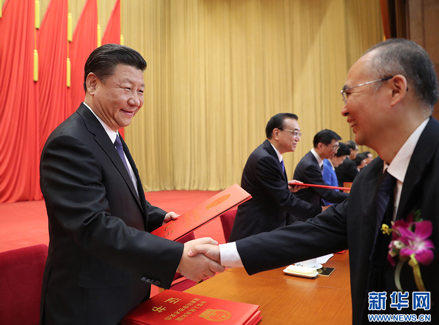 1月8日,国家科学技术奖励大会在北京人民大会堂隆重举行。中共中央总书记、国家主席、中央军委主席习近平向获得2017年度国家最高科学技术奖的中国疾病预防控制中心病毒病预防控制所侯云德院士颁发奖励证书。新华社记者 鞠鹏 摄