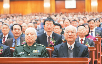 1月8日,2018年度国家科学技术奖励大会在北京人民大会堂举行,刘永坦(前右)、钱七虎(前左)摘取我国科技界最高奖励。