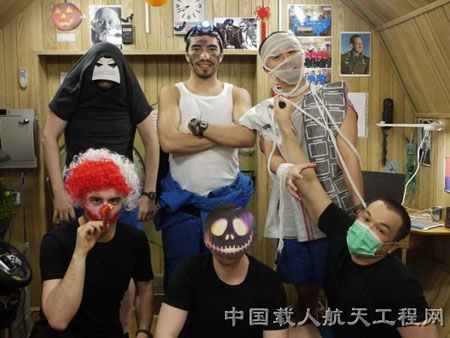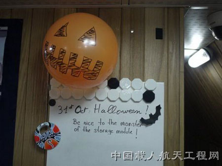 万圣节前夜是西方传统节日,在这一天人们会穿上怪异的服装、戴上面具,在轻松搞怪的氛围中度过。虽然火星500舱内的物品有限,但志愿者发挥想象手工制作了一些道具和墙壁装饰品,让整个舱内都充满了节日的气氛。 王跃作为舱内唯一的东方人,也在万圣夜秀出了其搞怪可爱的一面。