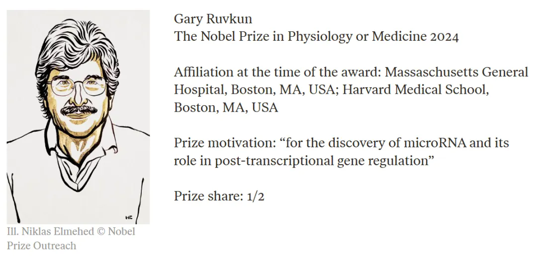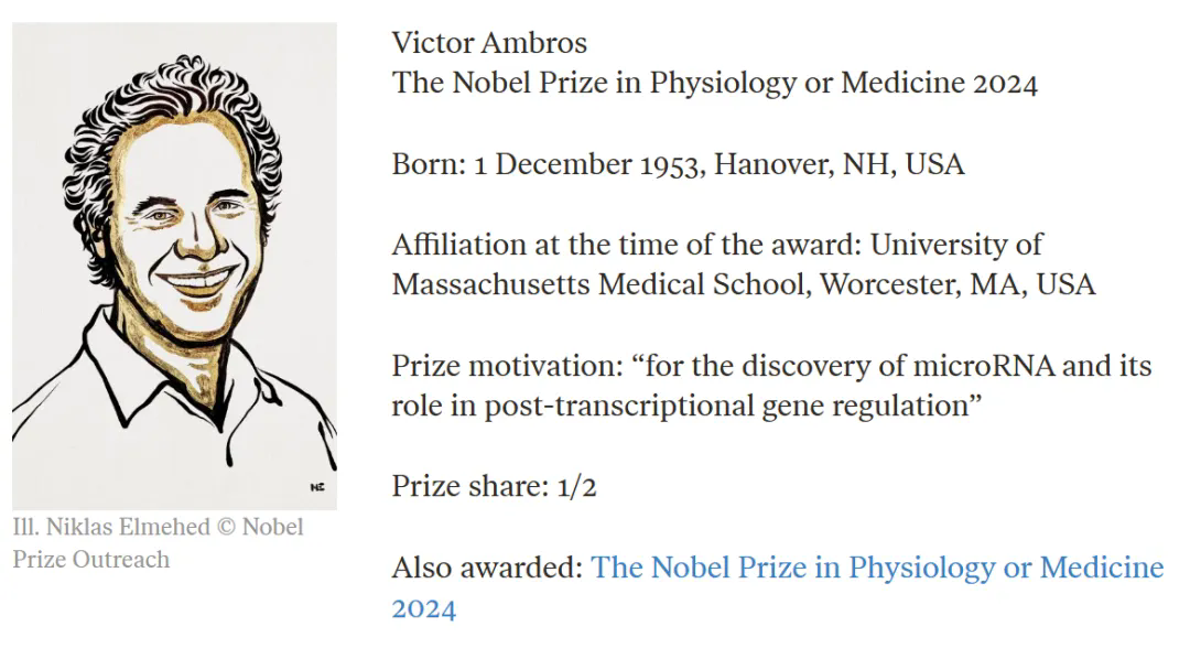 2024年诺贝尔生理学或医学奖授予“microRNA的发现及其在转录后基因调控中的作用”(for the discovery of microRNA and its role in post-transcriptional gene regulation)。