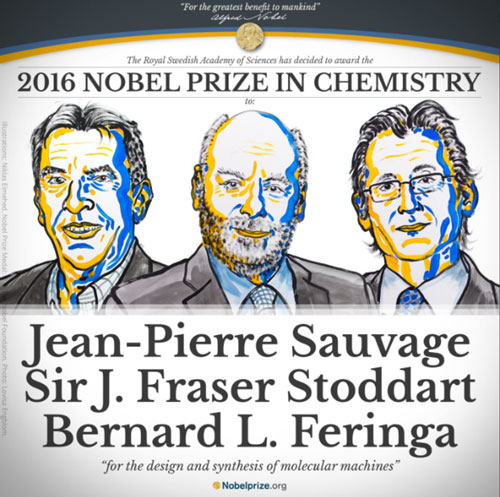 法国化学家让-皮埃尔-索维奇、英国化学家J-弗雷泽-斯托达特爵士以及荷兰化学家伯纳德-L-费林加凭借共同设计与合成分子机器获得了2016年诺贝尔化学奖。他们使得分子运动具有可控制性,只要加入能量,就能执行任务。分子机器是一个小型升降机、人造肌肉和体型极小的马达。