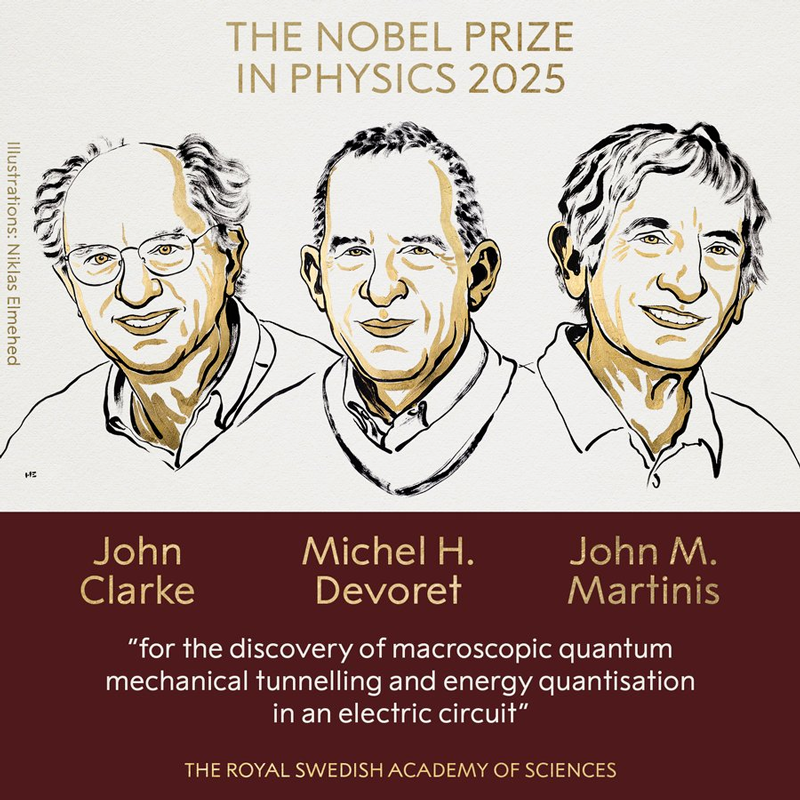 北京时间10月7日17时45分许,2025年诺贝尔物理学奖揭晓获奖名单。JohnClarke、Michel H.Devoret、John M.Martinis获奖,获奖理由是“在电路中发现宏观量子力学隧道效应与能量量子化现象”。奖金为1100万瑞典克朗。