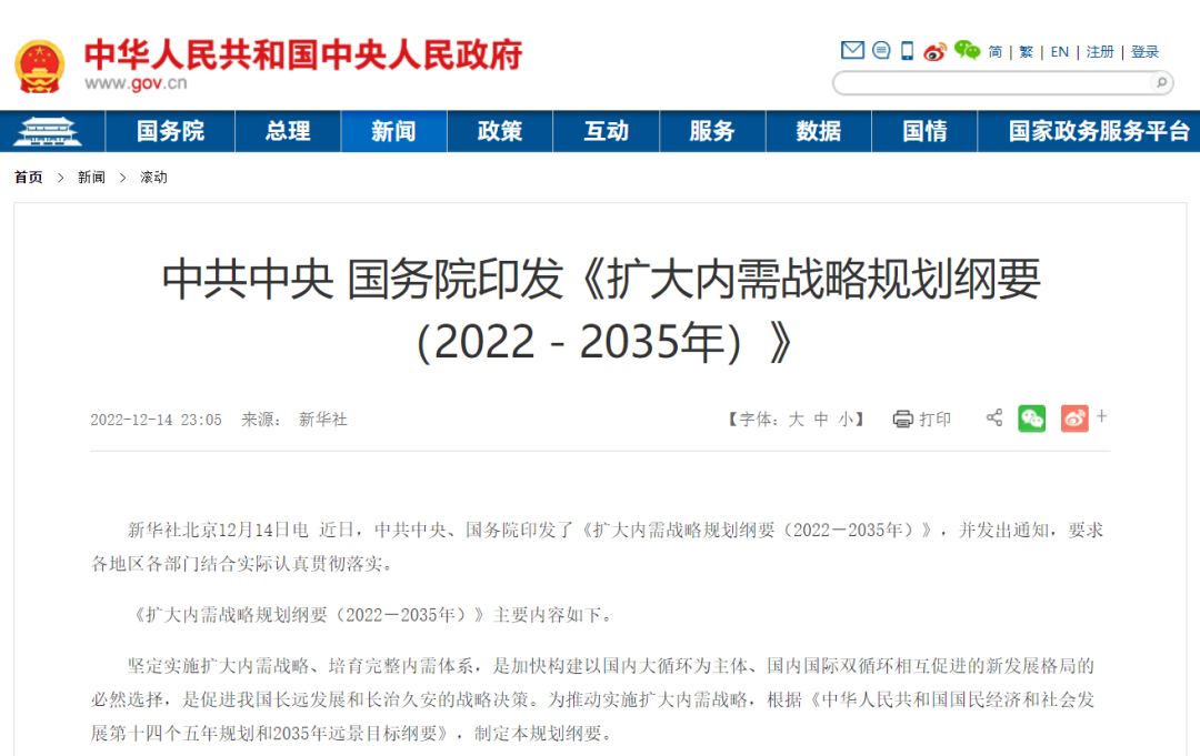 据了解,《纲要》是为推动实施扩大内需战略,根据《中华人民共和国国民经济和社会发展第十四个五年规划和2035年远景目标纲要》制定的,强调“坚定实施扩大内需战略、培育完整内需体系,是加快构建以国内大循环为主体、国内国际双循环相互促进的新发展格局的必然选择,是促进我国长远发展和长治久安的战略决策。”