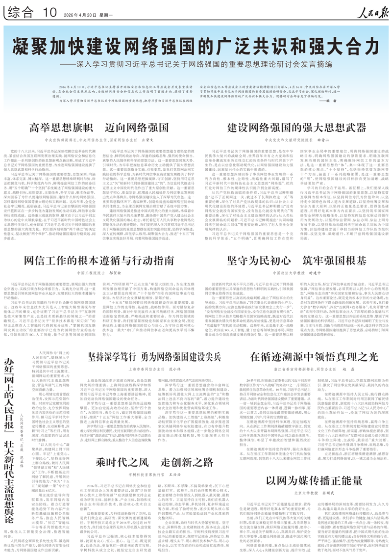 2026年4月20日出版的《人民日报》刊发深入学习贯彻习近平总书记关于网络强国的重要思想理论研讨会发言摘编。全文转发如下: