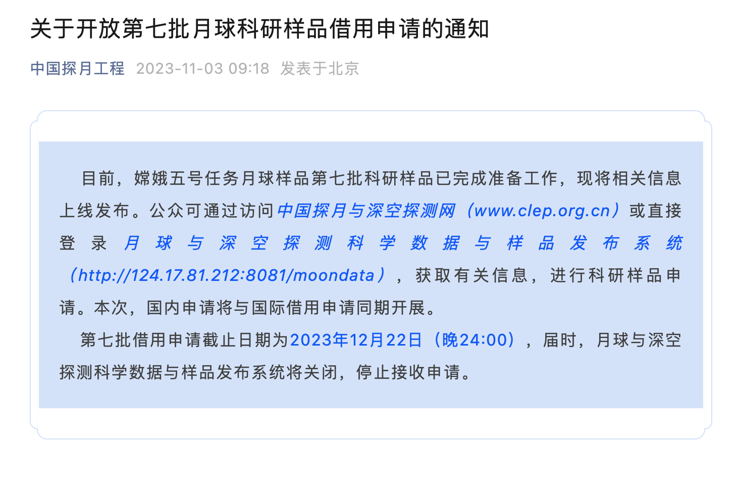 目前,嫦娥五号任务月球样品第七批科研样品已完成准备工作,现将相关信息上线发布。公众可通过访问中国探月与深空探测网(www.clep.org.cn)或直接登录月球与深空探测科学数据与样品发布系统(http://124.17.81.212:8081/moondata),获取有关信息,进行科研样品申请。本次,国内申请将与国际借用申请同期开展。