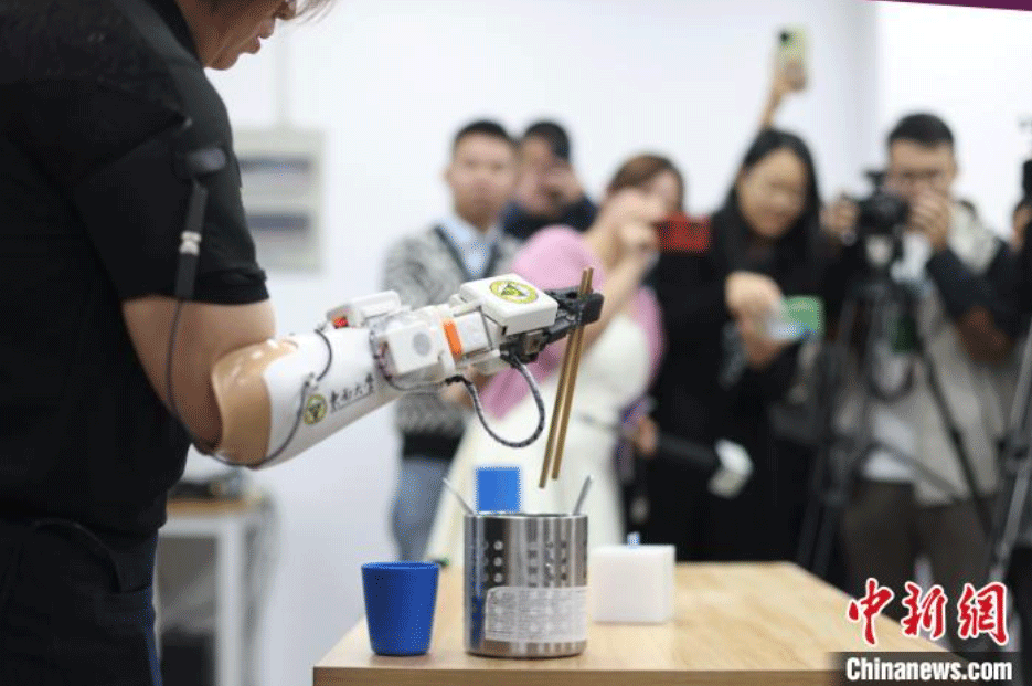 东南大学科研团队成员和参赛选手演示义肢“智能手”。中新网记者泱波摄
