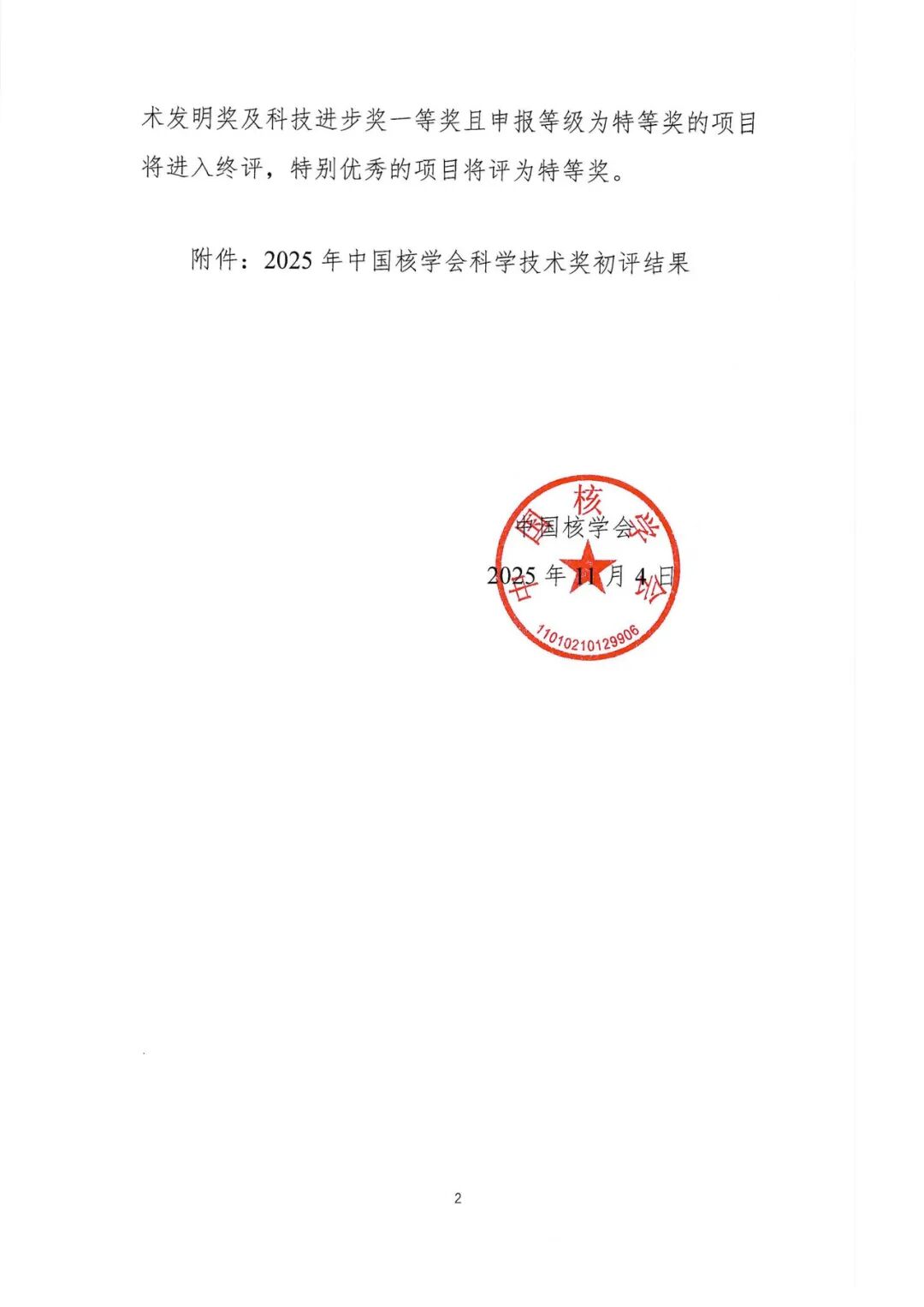 日前,中国核学会网站发布《2025年度“中国核学会科学技术奖”初评结果公示》,公示期为2025年11月4日至13日。