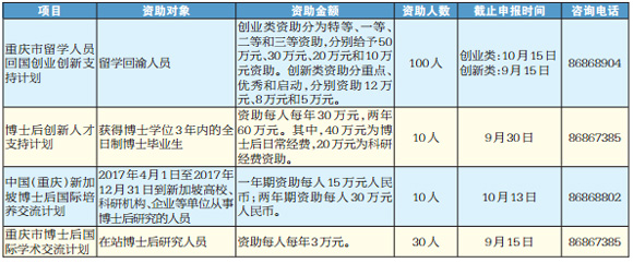 此外,博士后创新人才支持计划、中国(重庆)新加坡博士后国际培养交流计划以及重庆市博士后国际学术交流计划等创业创新人才支持项目也开始接受申报。