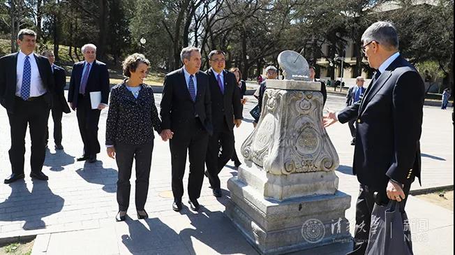 劳伦斯·巴科及夫人一行饶有兴致地参观了水木清华、清华学堂等清华园标志性建筑和景点,在日晷前驻足,了解清华校风,感悟清华百年风物,对清华怡人的校园环境连连称赞。