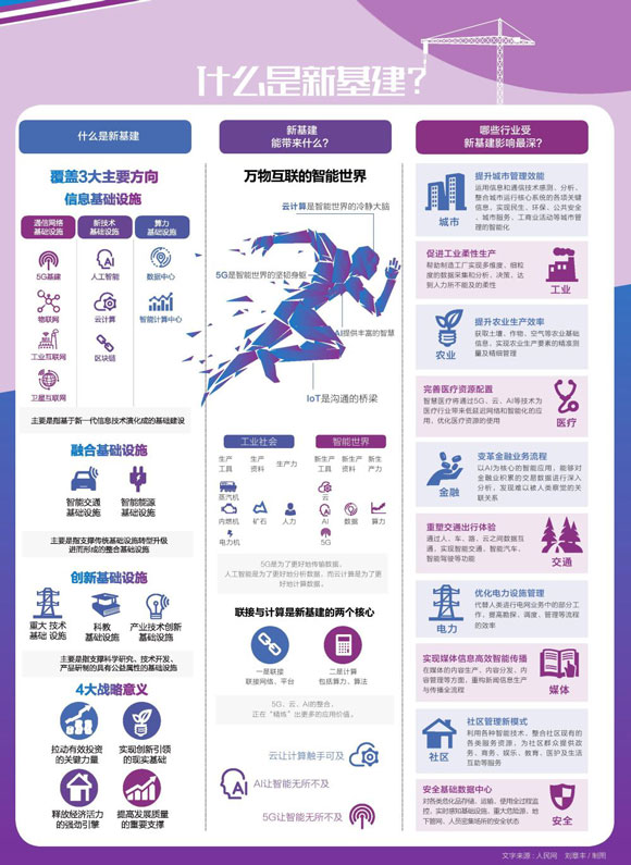 “新基建”覆盖三大主要方向:一是信息基础设施,包括以5G、物联网、工业互联网、卫星互联网为代表的通信网络基础设施,以人工智能、云计算、区块链等为代表的新技术基础设施,以数据中心、智能计算中心为代表的算力基础设施等。二是融合基础设施,主要指深度应用互联网、大数据、人工智能等技术,支撑传统基础设施转型升级,进而形成的融合基础设施,比如,智能交通基础设施、智慧能源基础设施等。三是创新基础设施,主要是指支撑科学研究、技术开发、产品研制的具有公益属性的基础设施,比如,重大科技基础设施、科教基础设施、产业技术创新基础设施等。