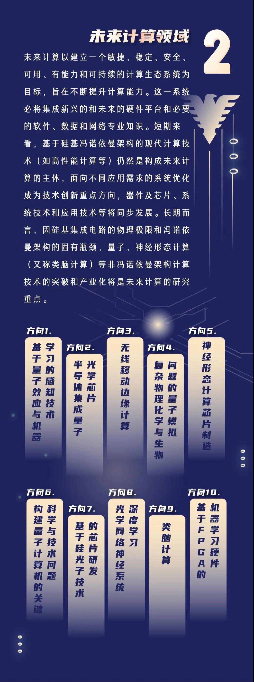 面向未来计算领域,报告认为短期内基于硅基冯·诺依曼架构的现代计算技术(如高性能计算)仍然是构成未来计算的主体,面向不同应用需求的系统优化成为技术创新重点方向,器件及芯片、系统技术和应用技术等将同步发展。长期而言,因硅基集成电路的物理极限和冯·诺依曼架构的固有瓶颈,量子、神经形态计算(又称类脑计算)等非冯·诺依曼架构计算技术的突破和产业化将是未来计算的研究重点。