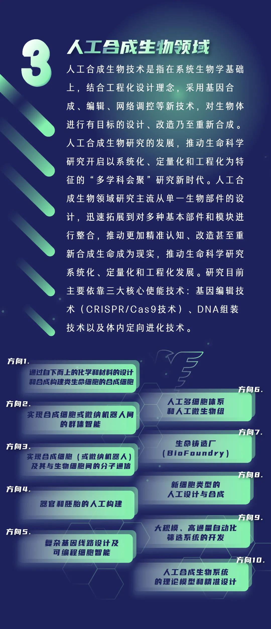 面向人工合成生物领域,报告认为人工合成生物研究的发展,推动生命科学研究开启以系统化、定量化和工程化为特征的“多学科会聚”研究新时代。人工合成生物领域研究主流从单一生物部件的设计,迅速拓展到对多种基本部件和模块进行整合,推动更加精准认知、改造甚至重新合成生命成为现实。研究目前主要依靠三大核心使能技术:基因编辑技术(CRISPR/Cas9技术)、DNA组装技术以及体内定向进化技术。