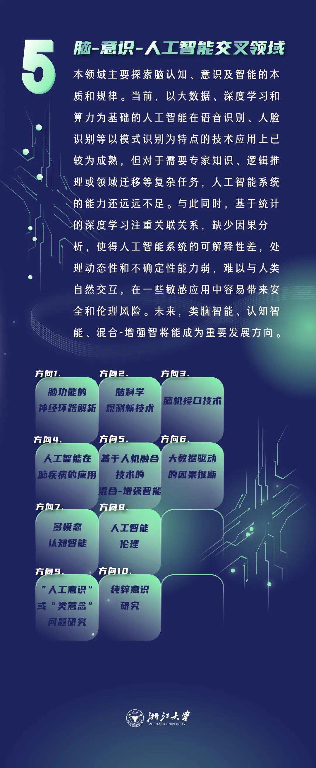 面向脑-意识-人工智能交叉领域,报告认为当前以大数据、深度学习和算力为基础的人工智能在语音识别、人脸识别等以模式识别为特点的技术应用上已较为成熟,但对于需要专家知识、逻辑推理或领域迁移的复杂性任务,人工智能系统的能力还远远不足。与此同时,基于统计的深度学习注重关联关系,缺少因果分析,使得人工智能系统的可解释性差,处理动态性和不确定性能力弱,难以与人类自然交互,在一些敏感应用中容易带来安全和伦理风险。未来,类脑智能、认知智能、混合-增强智将能成为重要发展方向。