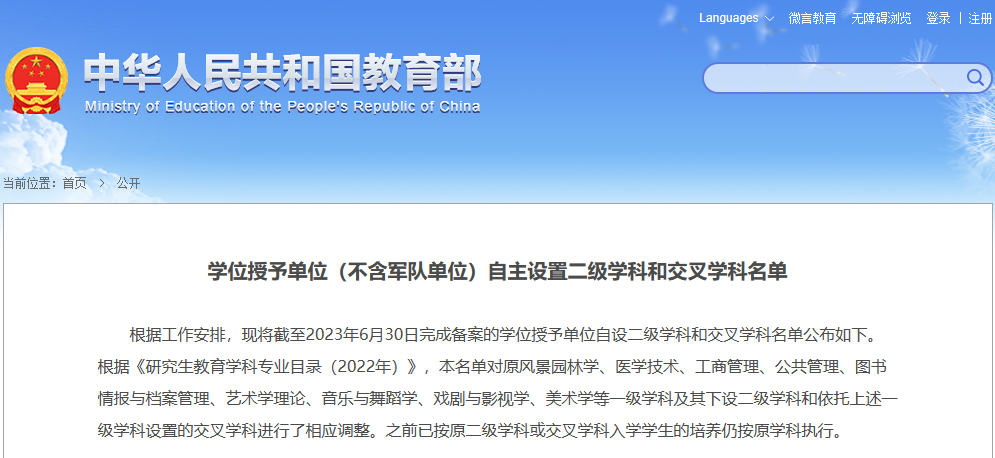 10月9日,教育部公布了最新的学位授予单位(不含军队单位)自主设置二级学科和交叉学科的名单。