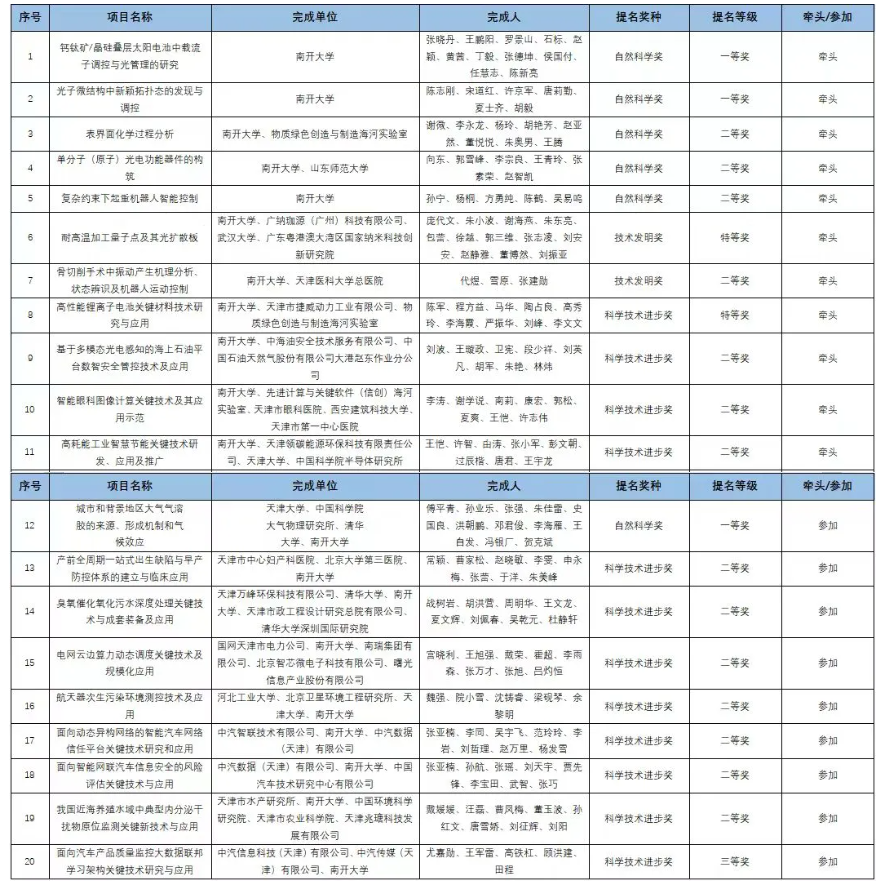 电子信息与光学工程学院张晓丹教授领衔完成的“钙钛矿/晶硅叠层太阳电池中载流子调控与光管理的研究”及物理科学学院陈志刚教授领衔完成的“光子微结构中新颖拓扑态的发现与调控”项目分别荣获自然科学一等奖。